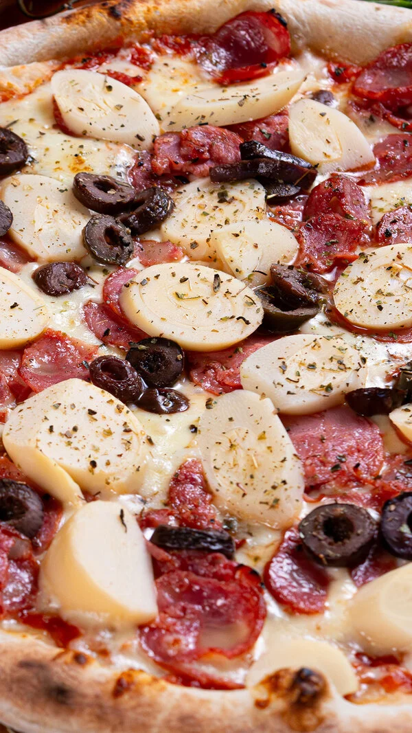 Molho de tomate, mozarela, calabresa, palmito, azeitonas pretas e orégano