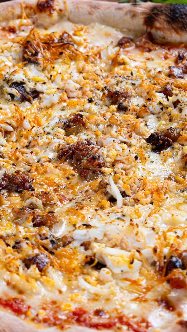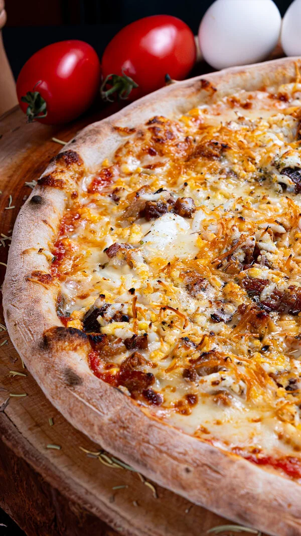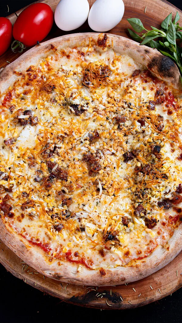 Molho de tomate, mozarela, bacon, ovos, parmesão e orégano