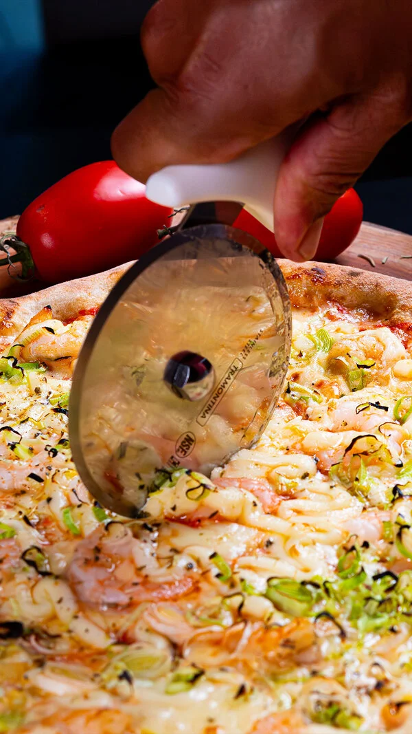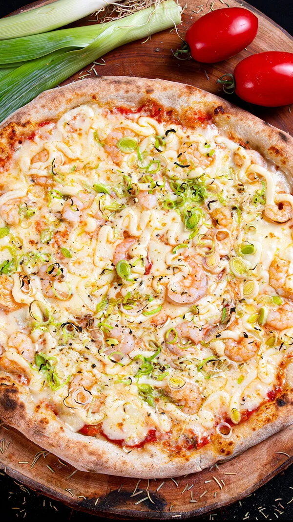 Molho de tomate, mozarela, alho poró, camarão e catupiry