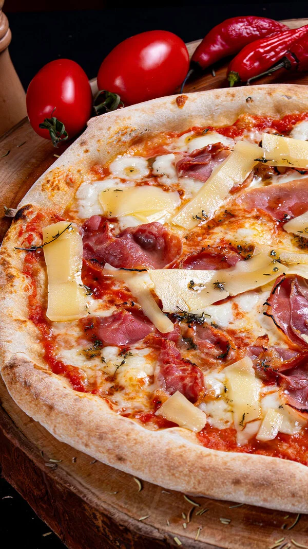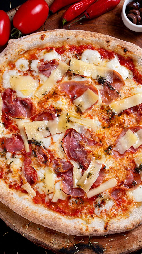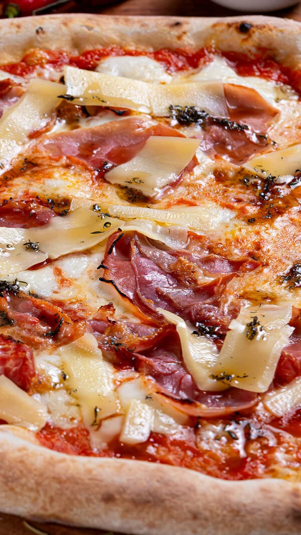 Molho de tomate, mozarela de búfala, parma crocante, lascas de parmesão regado com fio de mel e tomilho.