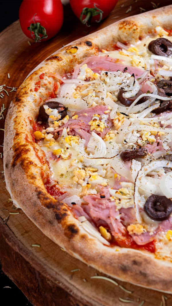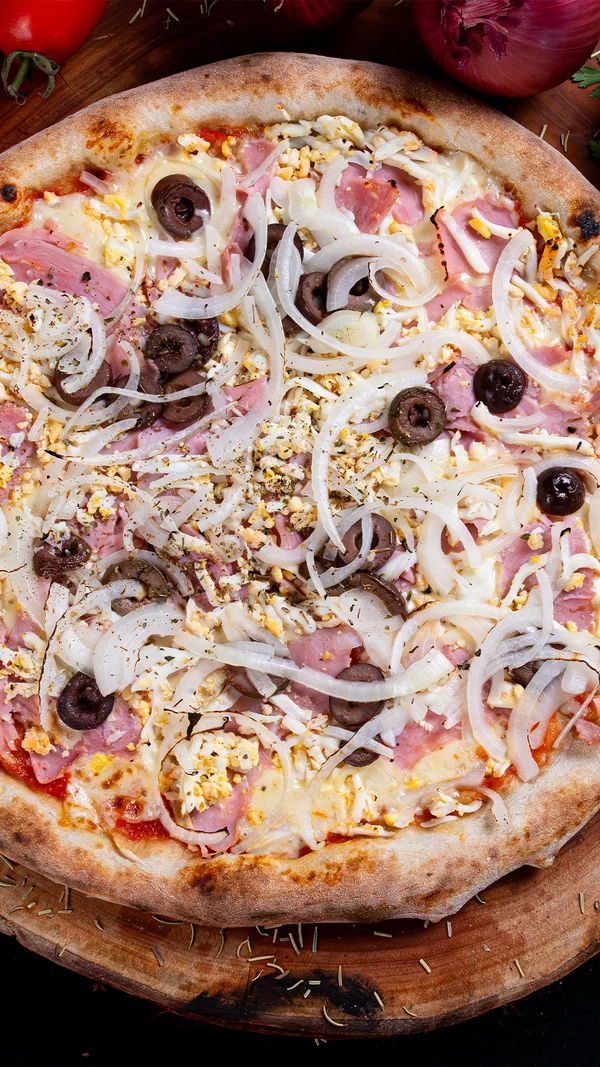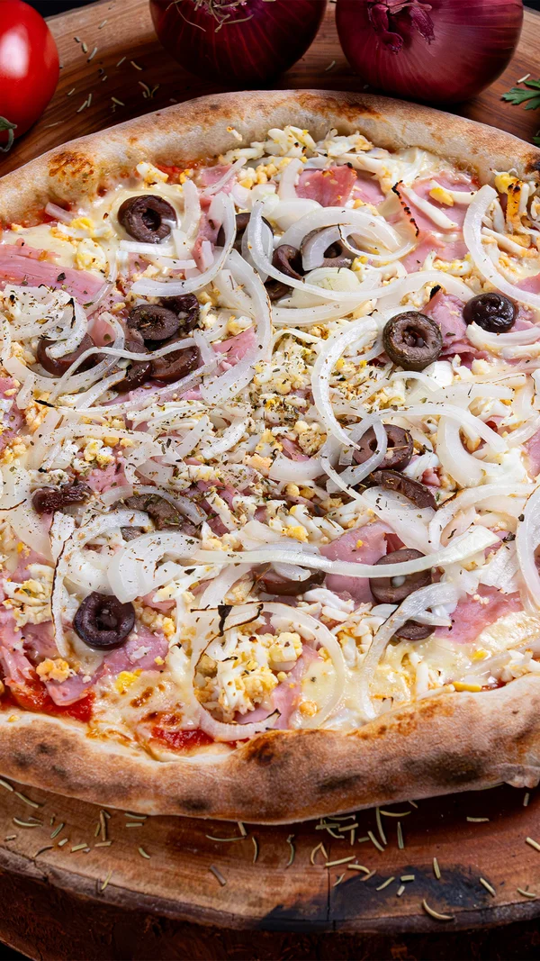 Molho de tomate, mozarela, presunto, ovos, azeitona, cebola e orégano.